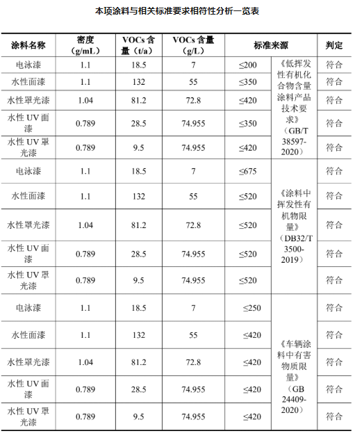 对比上表按照涂料密度、挥发分含量计较出来的涂料VOCs含量,本项目每种涂料的查验演讲中VOCs含量均低于上表计较值,因而本项目采纳最大值核算,利用上表计较的VOCs含量做为判断根据。按照上表,本项目所用涂料满脚江苏省处所尺度《涂猜中挥发性无机物限量》(DB32/T3500-2019)、《低挥发性无机化合物含量涂料产物手艺要求》(GB/T 38597- 2020)和《车辆涂猜中无害物质限量》(GB 24409-2020)中尺度限值要求。