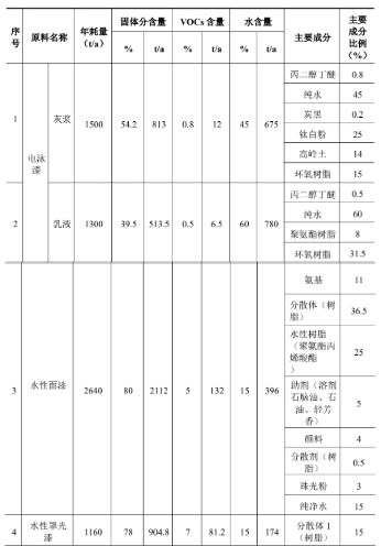 本项目水性面漆利用量为2640t/a,水性罩光漆利用量为1160t/a。水性面漆中VOCs含量132t/a,水性罩光漆中VOCs含量81。2t/a。本项目水性UV面漆利用量为300t/a,此中VOCs含量为28。5t/a;水性UV罩光漆利用量为 100t/a,此中VOCs含量为9。5t/a。本项目电泳漆、水性面漆、水性清漆、水性UV面漆、水性UV罩光漆VOCs含量要求参照《涂猜中挥发性无机物限量》(DB32/T 3500-2019)、《低挥发性无机化合物含量涂料产物手艺要求》(GB/T38597-2020)和《车辆涂猜中无害物质限量》(GB 24409-2020)限值要求。