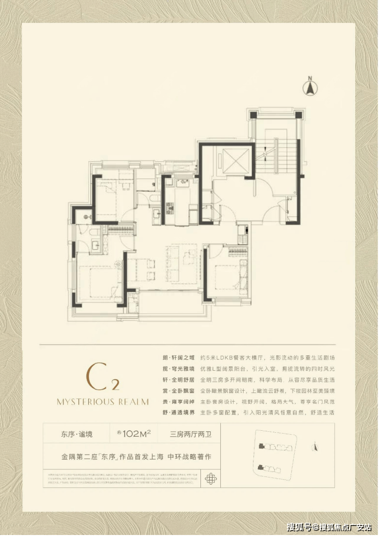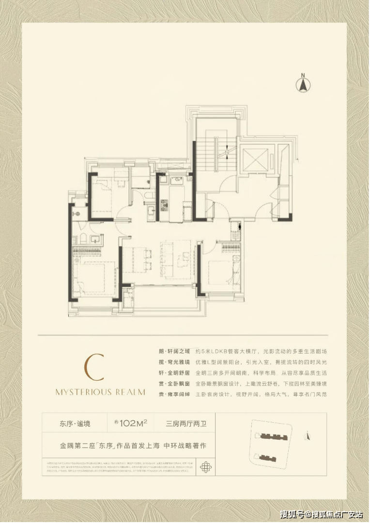 产物之一是建面约102平3房,3。5开间朝南,同面积段产物中稀有!具有约5米面宽的LDKB超大横厅!奢阔标准远超同级别产物!