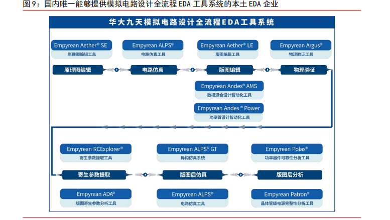 国产 EDA 行业领军企业,国内独一模仿电设想全流程笼盖。华大是国产 EDA 行业的取领军企业,次要处置用于集成电设想、制制和封拆的 EDA 东西软件开辟、发卖及相关办事营业。EDA 做为集成电范畴的上逛根本东西,贯穿于集成电的设想、制制、封测等各个环节,是集成电财产不成或缺的主要根本支柱之一。目前,公司的EDA 东西软件产物和办事笼盖模仿电设想、存储电设想、射频电设想、数字电设想、平板显示电设想、晶圆制制等范畴,正在各范畴各具劣势。此中,公司是国内独一可以或许供给模仿电设想全流程 EDA 东西系统的本土 EDA 企业,该 EDA 东西系统为用户供给了从电到邦畿、从设想到验证的一坐式完整处理方案。公司平板显示电设想全流程 EDA 东西系统全球领先,多项手艺达到国际领先程度,填补了国内平板设想EDA 专业软件的空白。