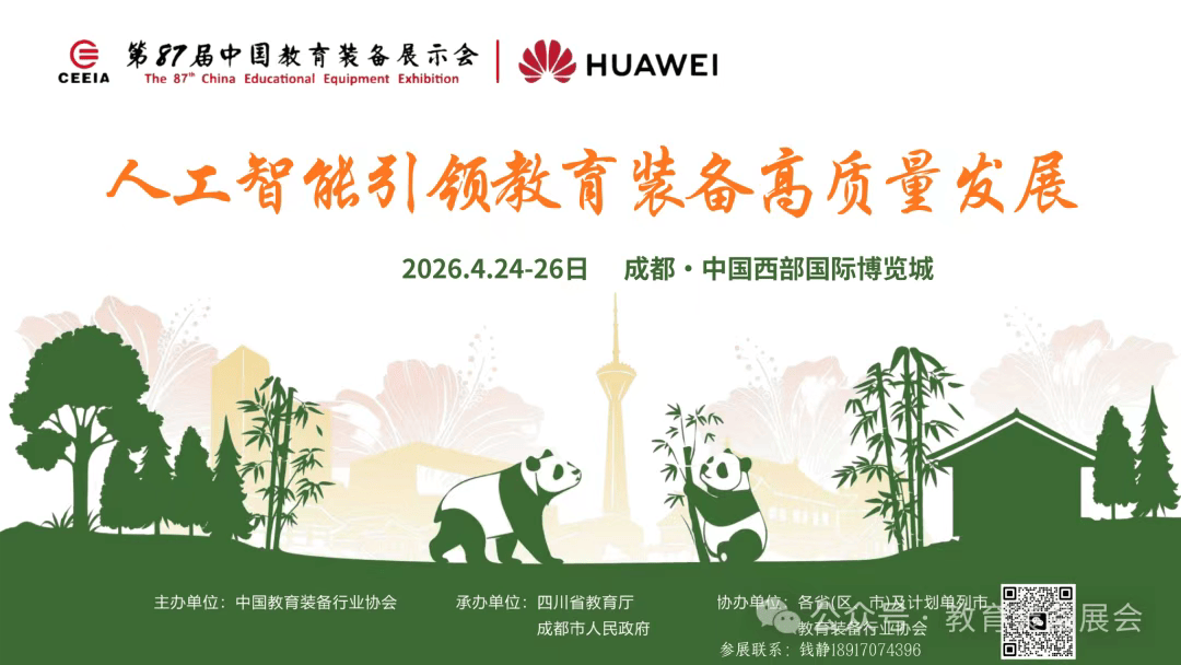 第87届中国教育配备展现会将于2026年4月24-26日正在成都・中国西部国际博览城隆沉举行。展现会以 “人工智能引领教育配备高质量成长” 为从题,由中国教育配备行业协会从办,成都会人平易近承办,各省(区、市)及打算单列市教育配备行业协会协办。